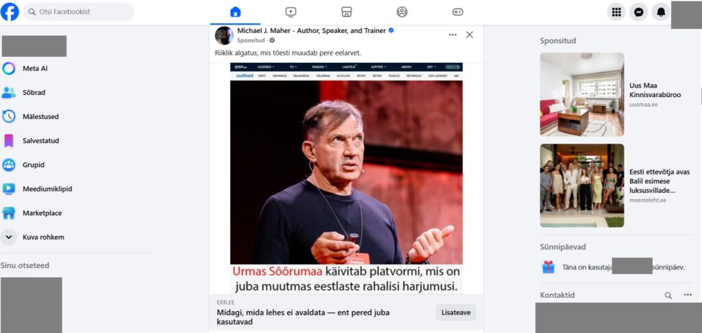 Facebookis ringleb sponsoreeritud postitus, mis kasutab ERR-i menüü kujundusi, kuigi tegelikult artikli jagamisel sellised kujundused kaasa ei tule. Lähemal vaatlusel on näha, et ERR-ist on asi kaugel.