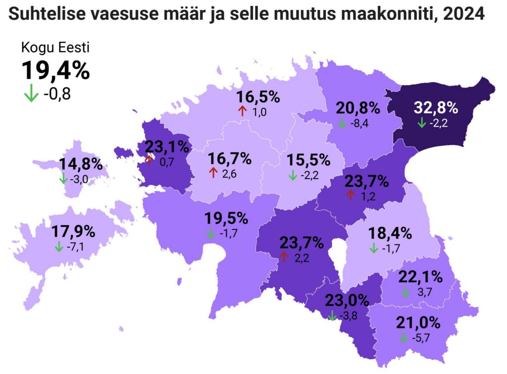 Kõige suurem oli möödunud aastal suhtelises vaesuses elavate inimeste osakaal Ida-Viru maakonnas (33 protsenti), kus see oli ligikaudu kaks korra suurem kui Hiiumaal (14,8 protsenti), Järvamaal (15,5 protsenti), Harjumaal (16,5 protsenti) ja Raplamaal (16,7 protsenti). Enamikus maakondades suhtelise vaesuse määr vähenes. „Suurim vähenemine toimus Lääne-Viru, Saare ja Võru maakonnas. Väikesel määral ehk ühe protsendipunkti võrra kasvas suhteline vaesus Harju maakonnas, sealhulgas Tallinnas. Rapla maakonnas kasvas suhtelise vaesuse määr 2,6 protsendipunkti võrra ja Jõgeva maakonnas 1,2 protsendipunkti võrra,“ ütles Remmelg.